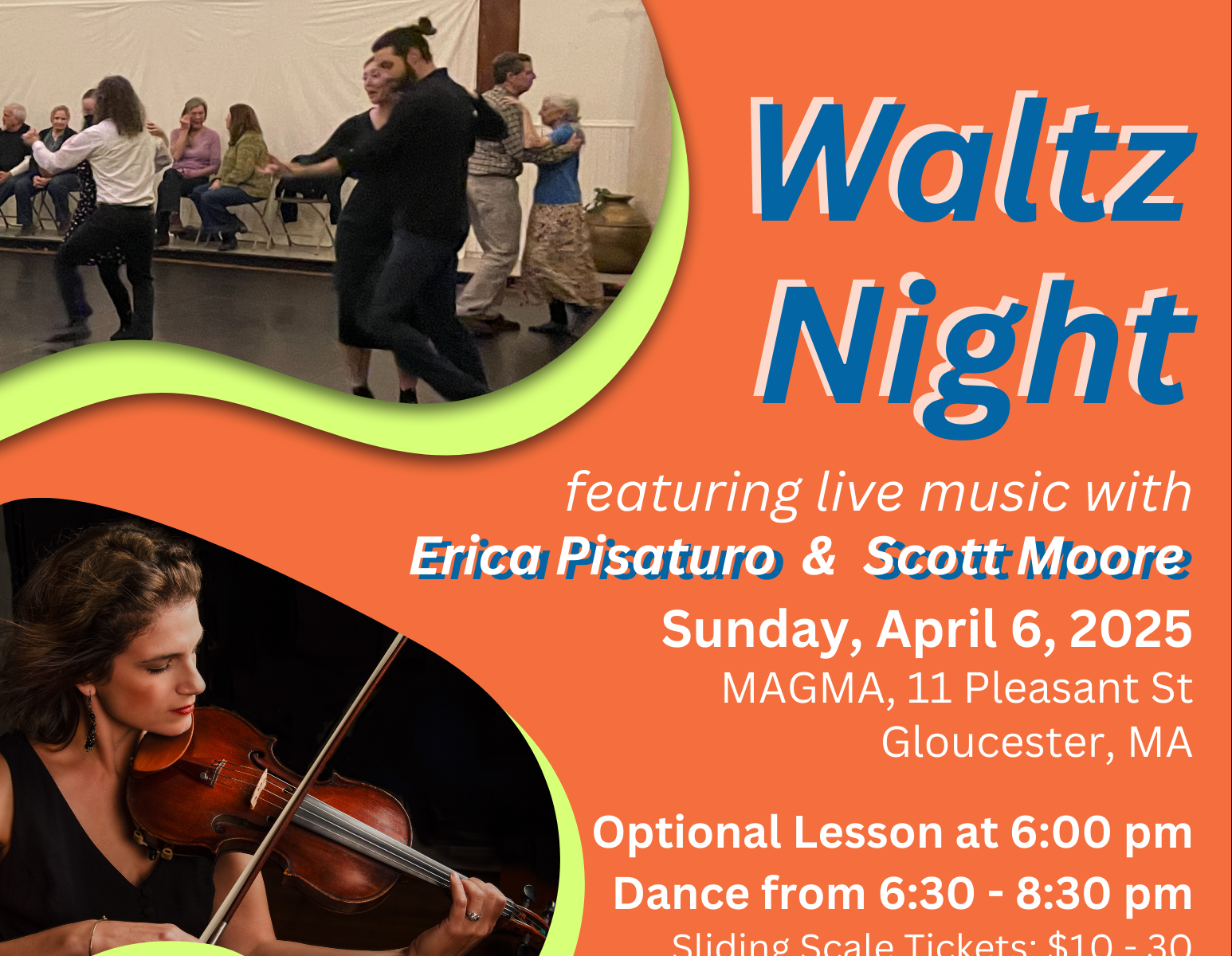 Waltz the night away at MAGMA on Sunday, April 6, 2025 with our monthly social dance night! This is not the formal, ballroom-style waltz. This is the easy going, easy to learn, and very fun to do folk waltz. Enjoy live music from Erica Pisaturo and Scott Moore so good that it’s worth the price of admission just to sit hear them play.