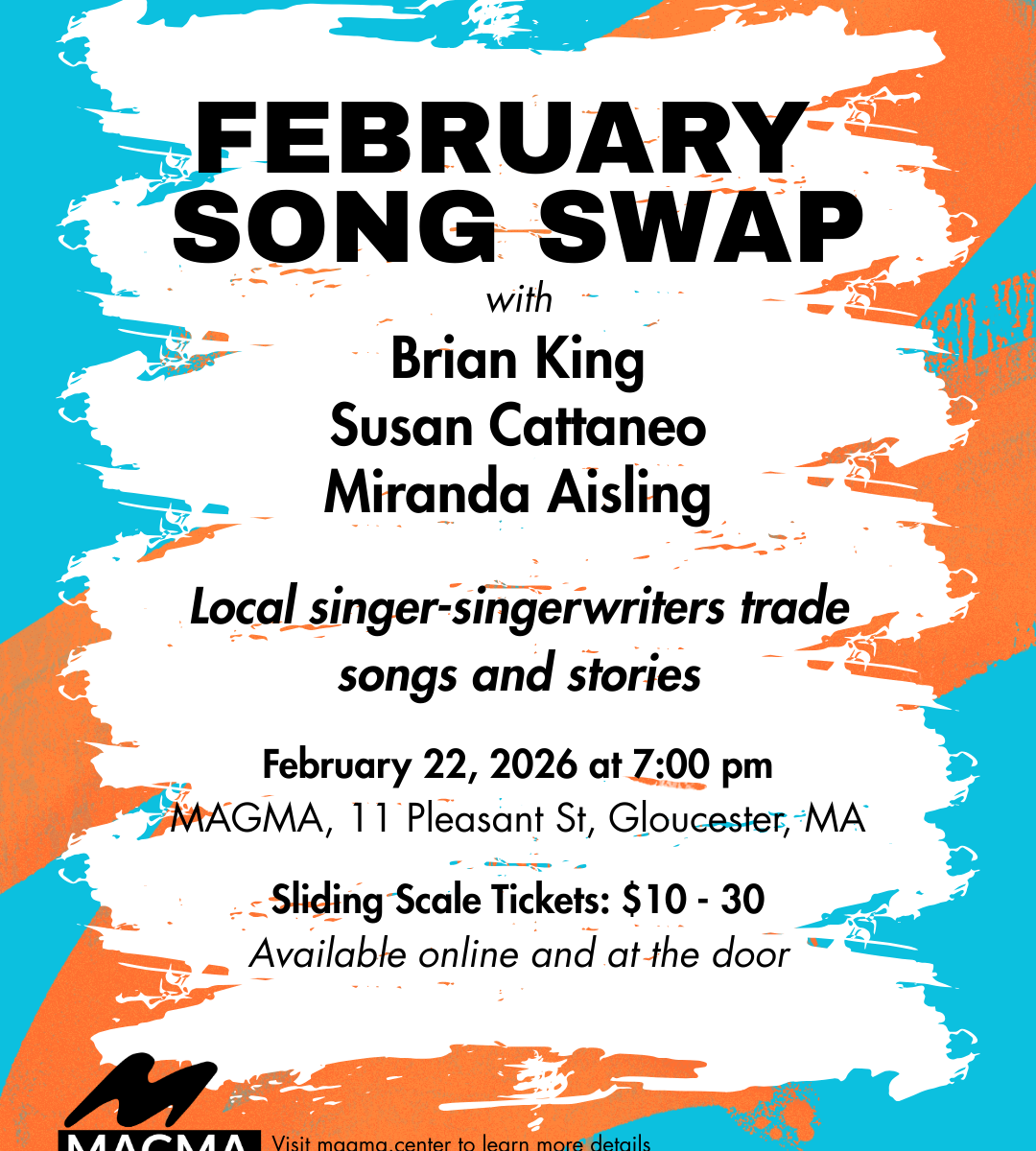 Local singer-songwriters Brian King, Susan Cattaneo, and Miranda Aisling are coming together at MAGMA to trade songs and stories. Join them on Sunday, February 22, 2026 at 7:00 pm.