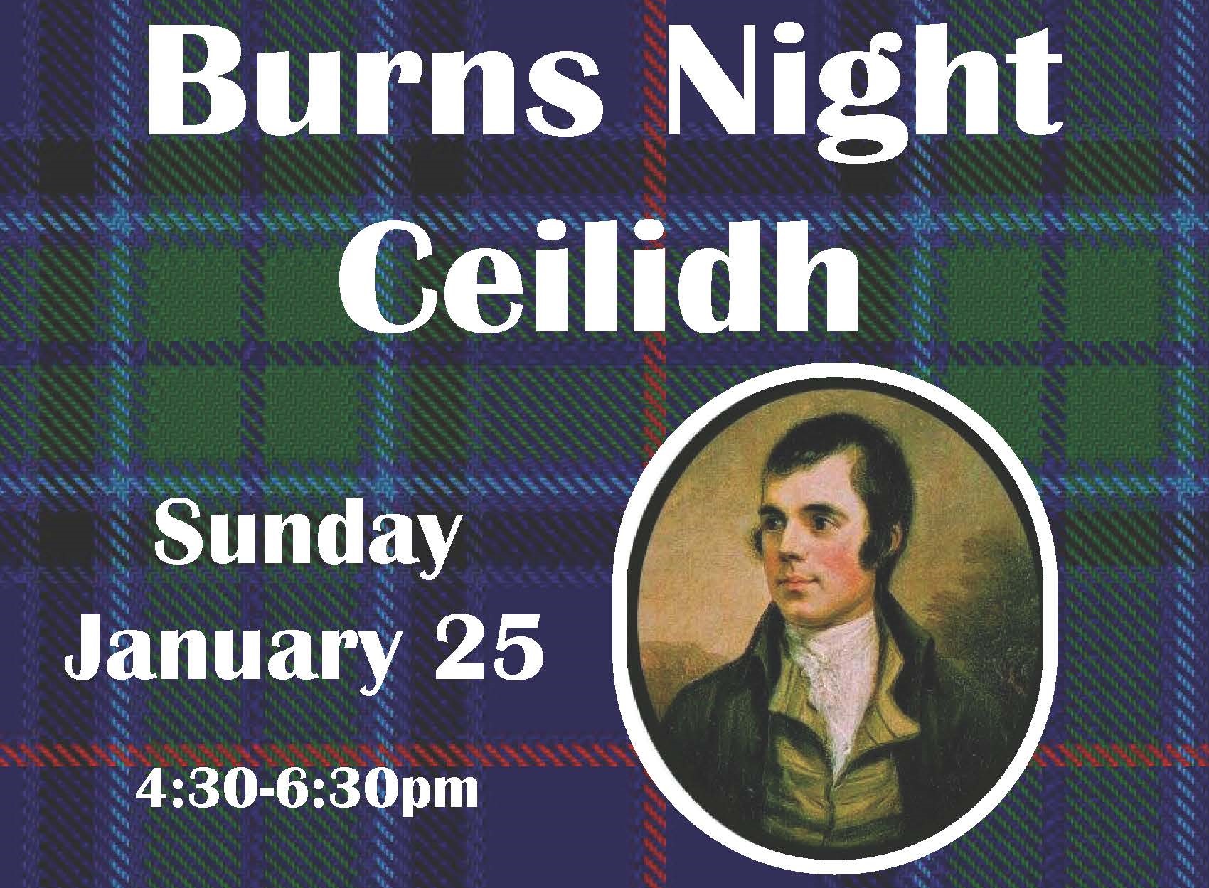 Burn's Night Ceilidh Sunday January 25, 4:30pm $25 adults, $10 kids with musicians Michael O'Leary, Susie Petrov, and Stephen Thomforde Burn's Night is a tradition in Scotland (and beyond) to …